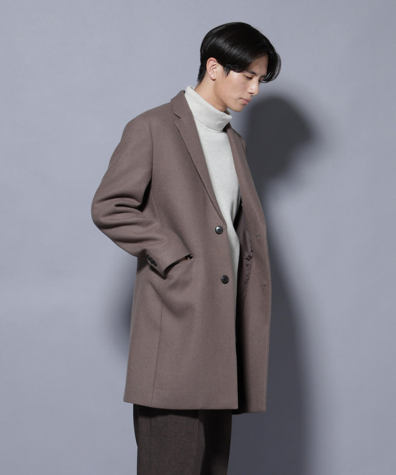 柔らかなウールブレンドメルトン素材で仕上げた、王道かつ洗練されたチェスターコート。細身でシャープなシルエットに、ややシェイプを効かせたウエストラインがスタイルをすっきり見せてくれる一着。ビジネスシーンはもちろん、休日のカジュアルスタイルにも活躍する汎用性の高いアイテムです。